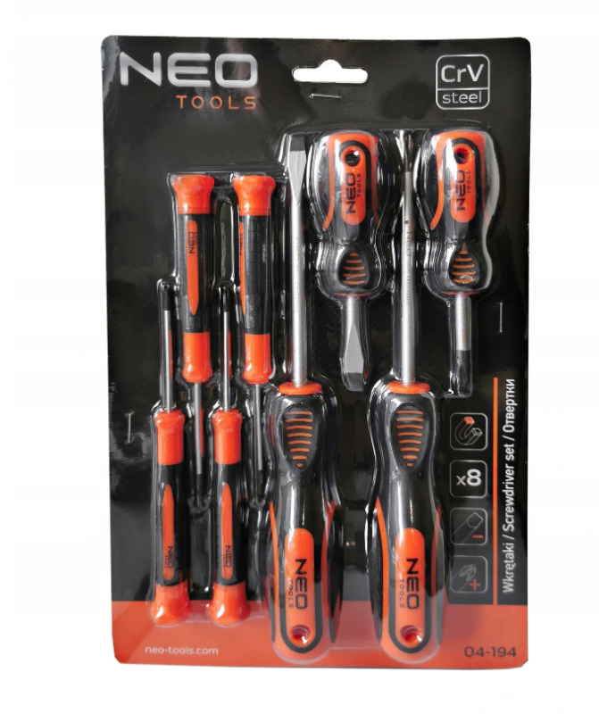 Zestaw wkrętaków NEO zawiera 4 wkrętaki: płaskie i krzyżowe. Grot wkrętaka wykonany jest z wyjątkowo wytrzymałej stali chromowo-molibdenowej. Końcówka robocza grota została poddana obróbce cieplnej, dzięki czemu uzyskano odpowiednią twardość i odporność na zgięcia 56 HRC. Wkrętak posiada magnetyczną końcówkę. Trójgraniasty kształt uchwytu z wyprofilowanym oparciem dla kciuka zmniejsza obciążenie dłoni podczas pracy i ułatwia uzyskanie optymalnego momentu obrotowego. Uchwyt dwumateriałowy zapobiega ślizganiu się w dłoni, odporny jest na działanie chemikaliów, olejów i smarów. Jakość narzędzia potwierdzona certyfikatem TÜV i 25-letnią gwarancją producenta.
