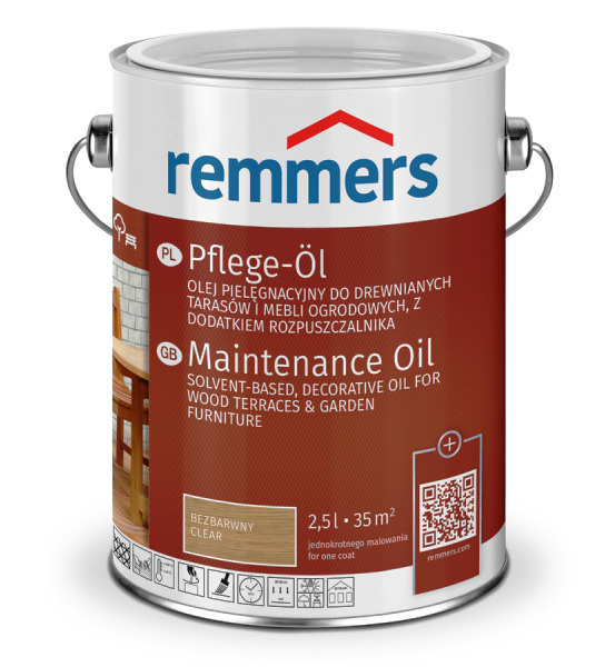 Olej pielęgnacyjnych Remmers do drewnianych tarasów i mebli ogrodowych z dodatkiem rozpuszczalnika. Produkt przeznaczony do drewna stosowanego wewnątrz i na zewnątrz pomieszczeń. Działa hydrofobizująca, tworzy powłokę odporną na wpływ czynnik atmosferycznych, reguluje wilgotność drewna, a także chroni je przed wyschnięciem. Warianty pigmentowane chronią drewno przed szarzeniem.