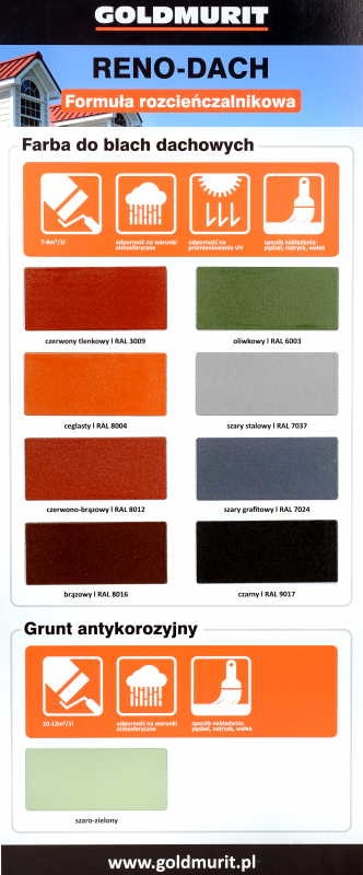 Reno-Dach to akrylowa, wodorozcieńczalna farba ochronno-dekoracyjna przeznaczona do malowania dachów i innych elementów wykonanych z blachy ocynkowanej oraz aluocynkowej.